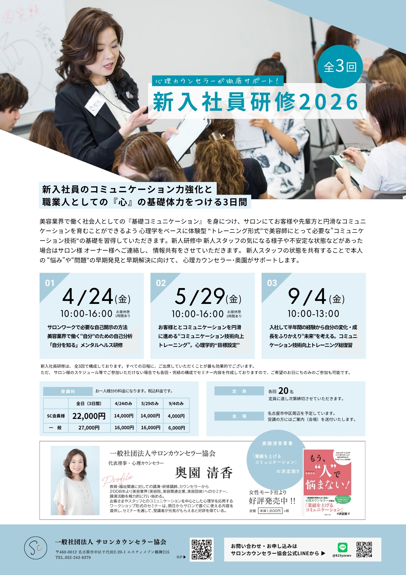 新人研修プログラムは、全3 回で構成しております。すべての日程に、ご出席していただくことが最も効果的でございます。ただ、サロン様のスケジュール等でご参加いただけない場合でも各回・完結の構成でセミナー内容を作成しておりますので、ご希望のお日にちのみのご参加も可能です。